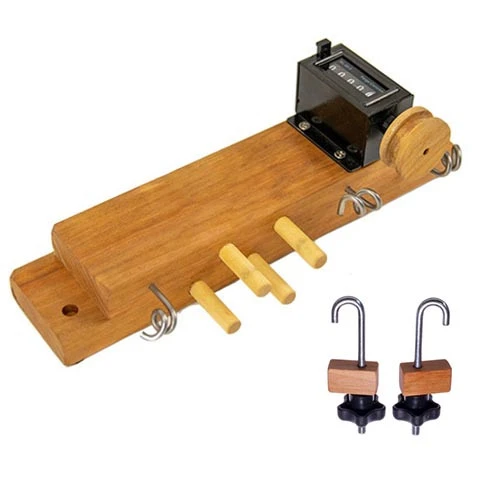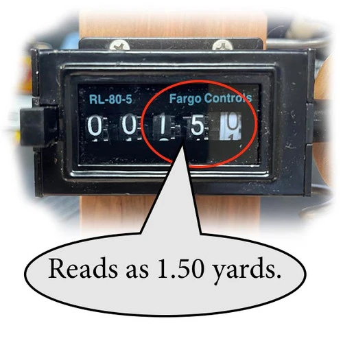 A tensioned yarn meter that can accommodate yarns from lace weight (0) to super bulky (6). Analog counter measures in yards. Clamps to tables up to 2″ thick.