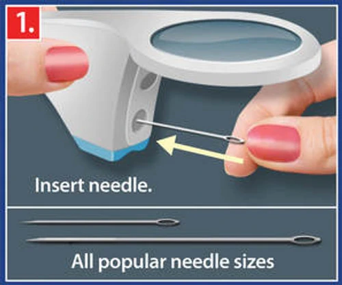Thread needles easily with magnifier and light. Works with all popular needle sizes. Includes an LED light. Great for hand-held threading or use on the tabletop.